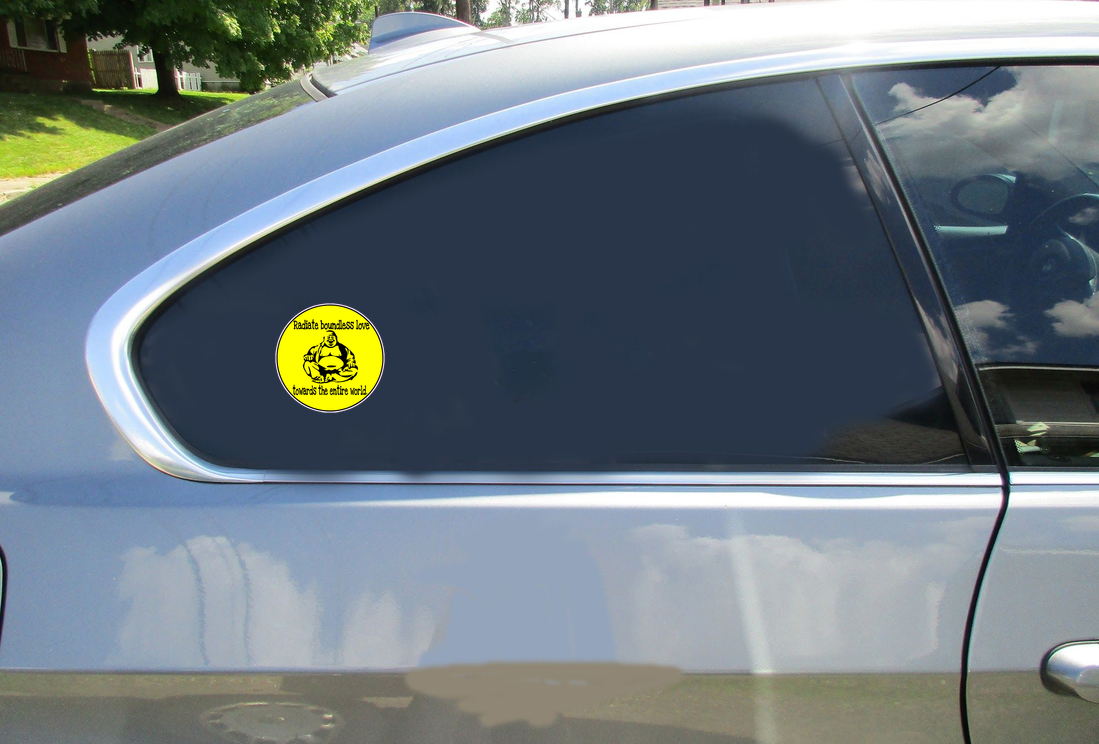 This Radiate Boundless Love Buddha Sticker is printed on high quality sticker vinyl intended for outdoor use. These high quality durable stickers will stick to almost any clean flat surface indoors or outdoors. Buy this custom Radiate Boundless Love Buddha Sticker in the size of your choice and use it for a car sticker, truck sticker, bumper sticker, laptop sticker, phone sticker, beer cooler sticker, and much more!