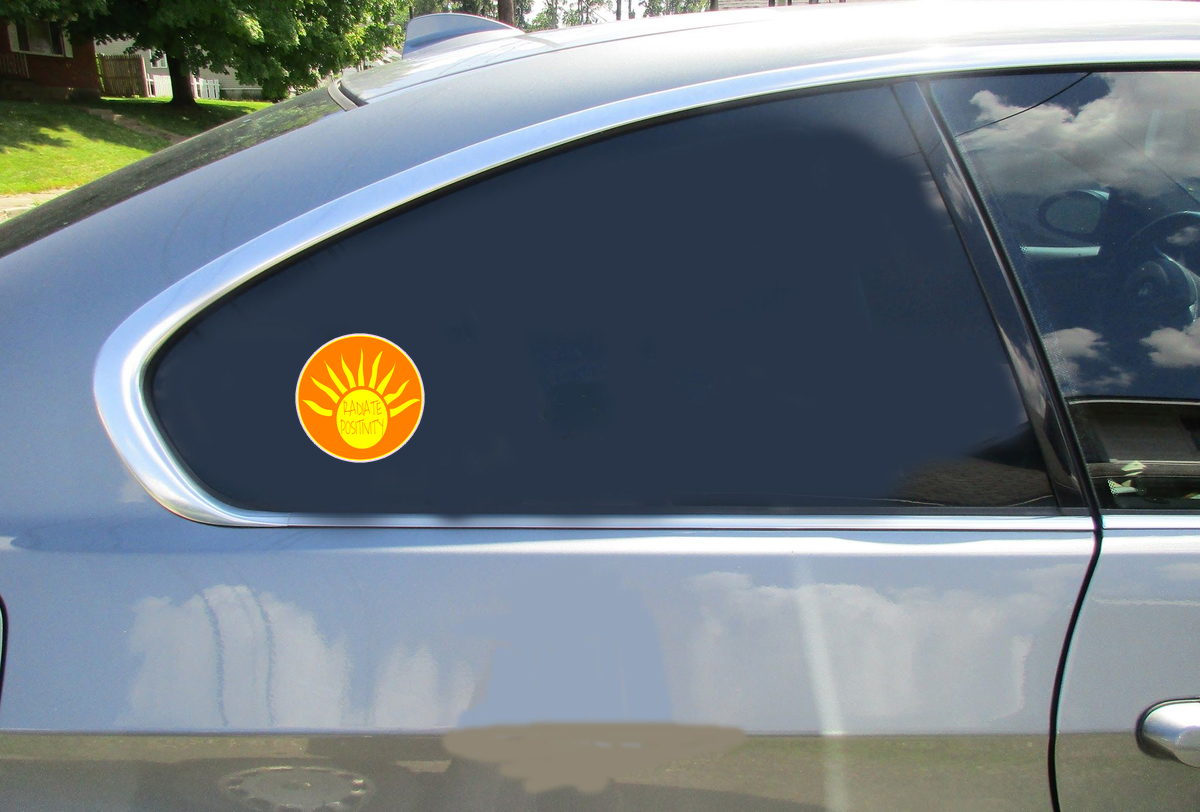 This Radiate Positivity Sunshine Sticker is printed on high quality sticker vinyl intended for outdoor use. These high quality durable stickers will stick to almost any clean flat surface indoors or outdoors. Buy this custom Radiate Positivity Sunshine Sticker in the size of your choice and use it for a car sticker, truck sticker, bumper sticker, laptop sticker, phone sticker, beer cooler sticker, and much more!